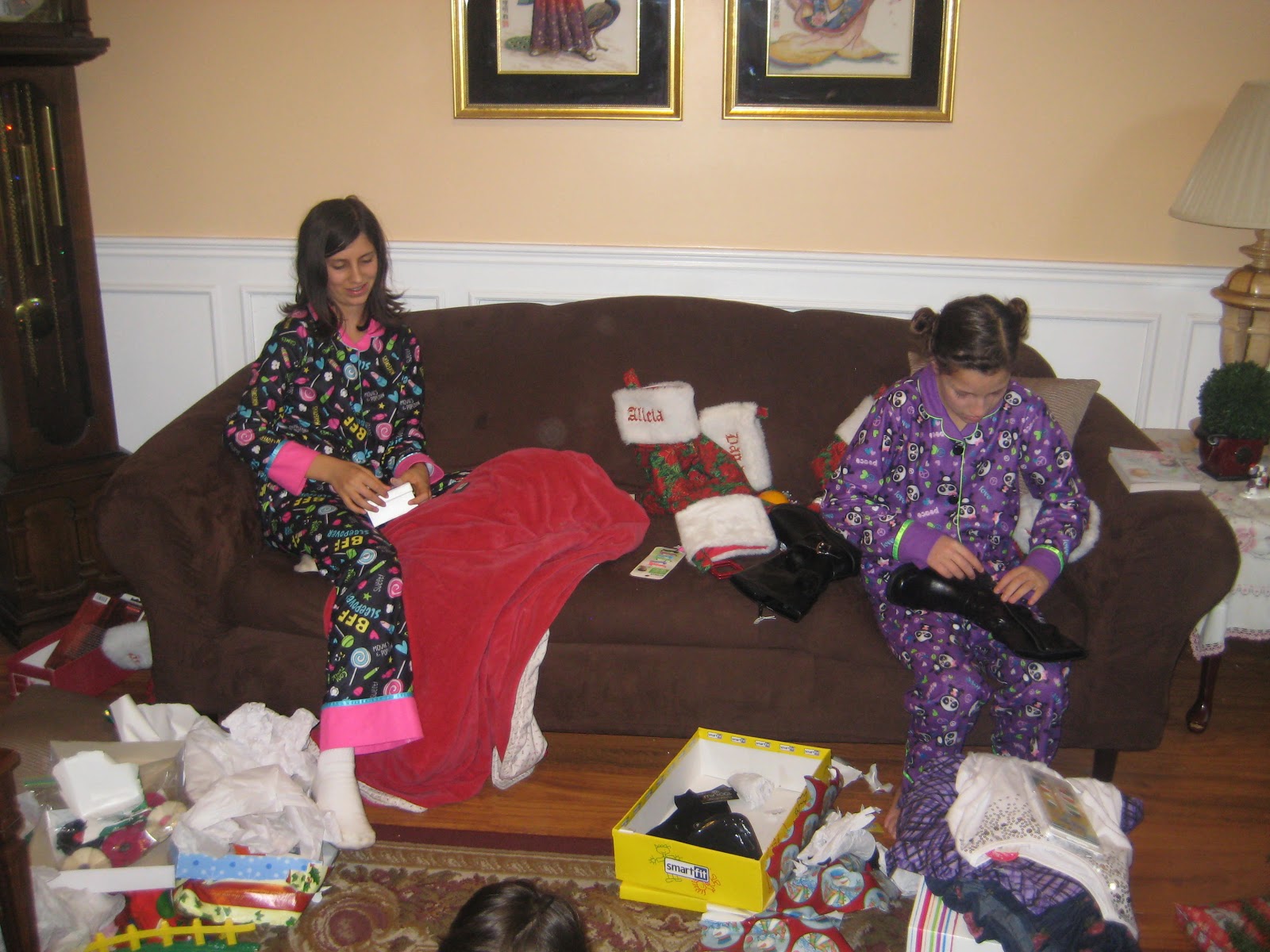 Christmas morning was nice and relaxing, with present opening beginning around 8 a.m. Now that is my kind of morning. How did the kids wait that long you ask? We kept them up late the night before doing gingerbread houses, so they all slept in :). Megan did get up at around 7ish, but with no one else up, she climbed into bed with John and I and promptly fell back to sleep. Alicia admitted to waking up around 7 a.m., but upon hearing no movement in the house, she remained in her bed and played her DS.